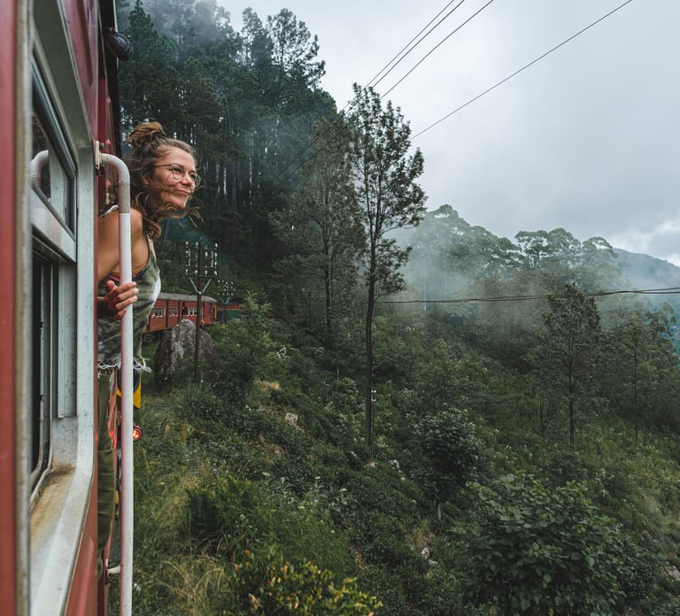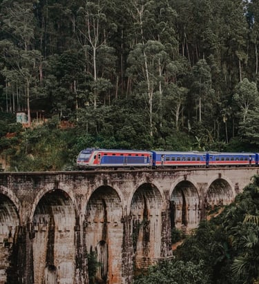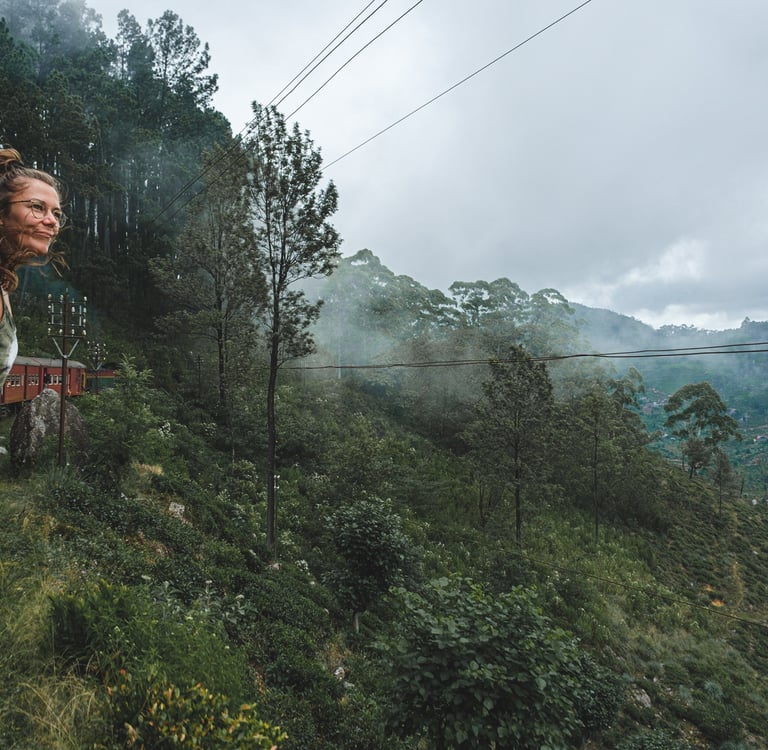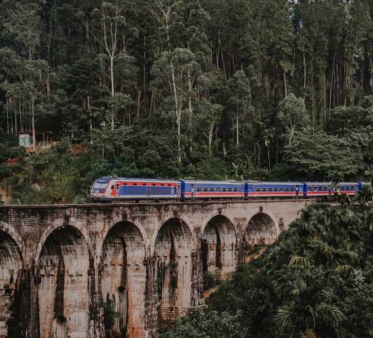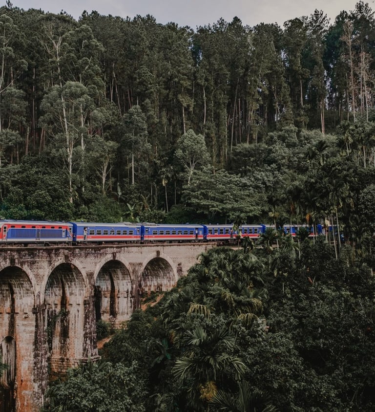 We’ll board the famous Ella–Kandy train, winding through tunnels, tea fields, and misty forests.